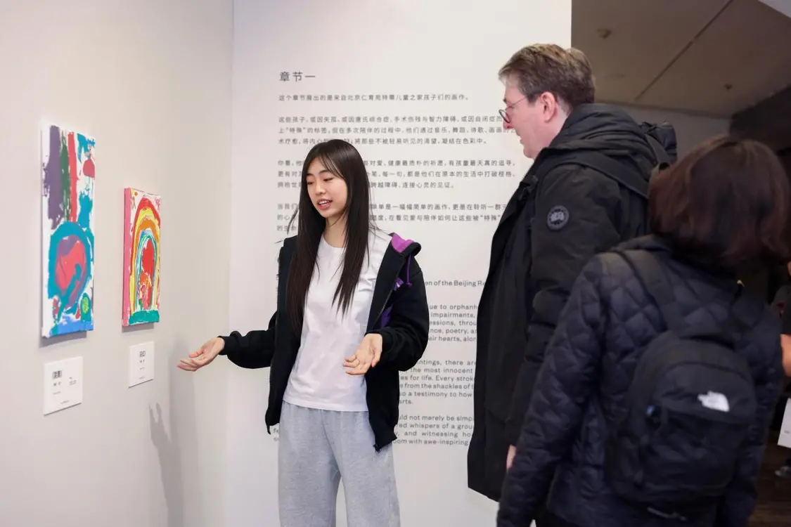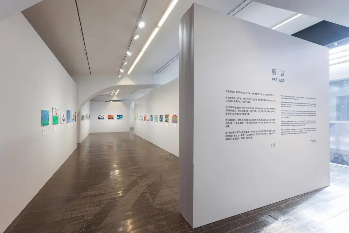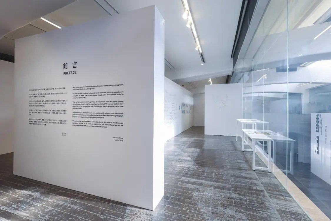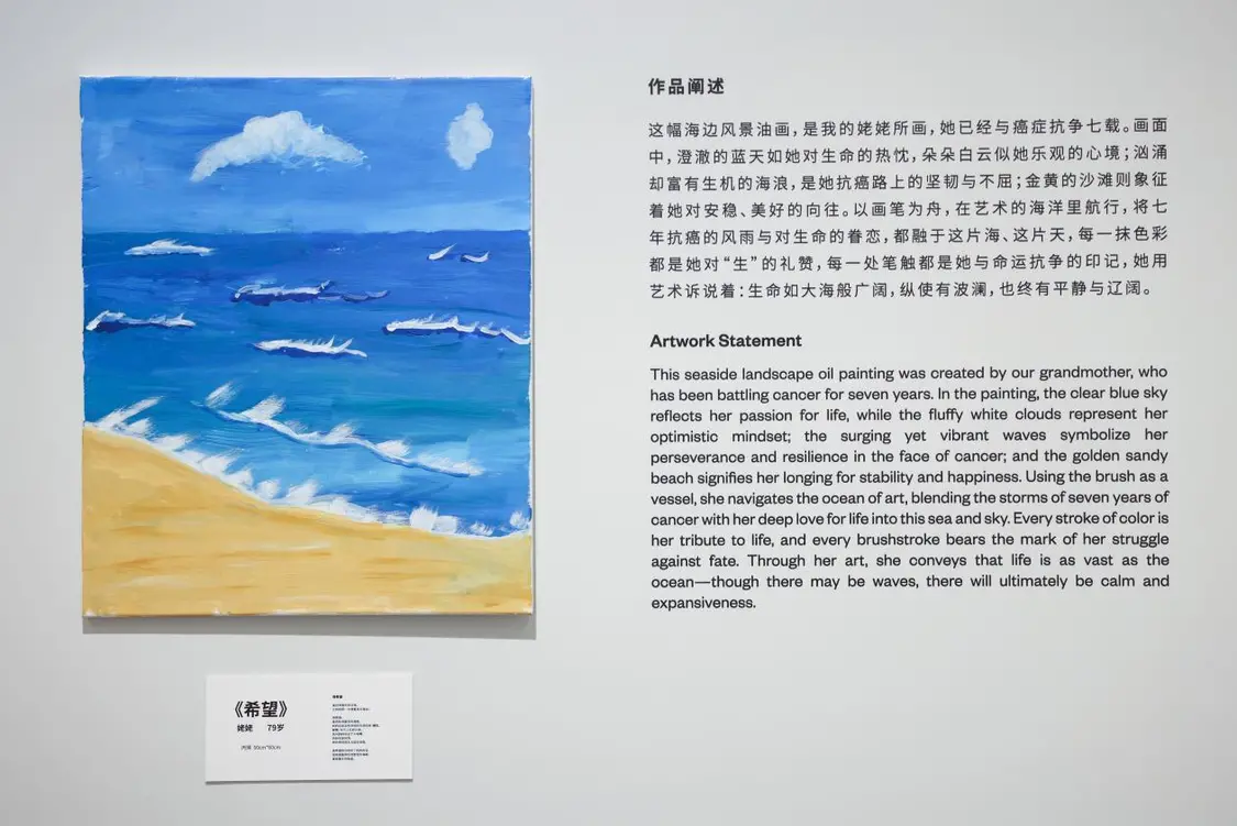 UCCA美术馆的大会客厅里,画作与诗歌静静陈列。创作者包括特需儿童(自闭症、唐氏综合症等)、骨肿瘤患者(多为儿童及青少年)与接受安宁疗护的老人。而搭建起他们与世界链接的,是清华附中国际部的高中生志愿者,用善意搭建起沟通的桥梁。