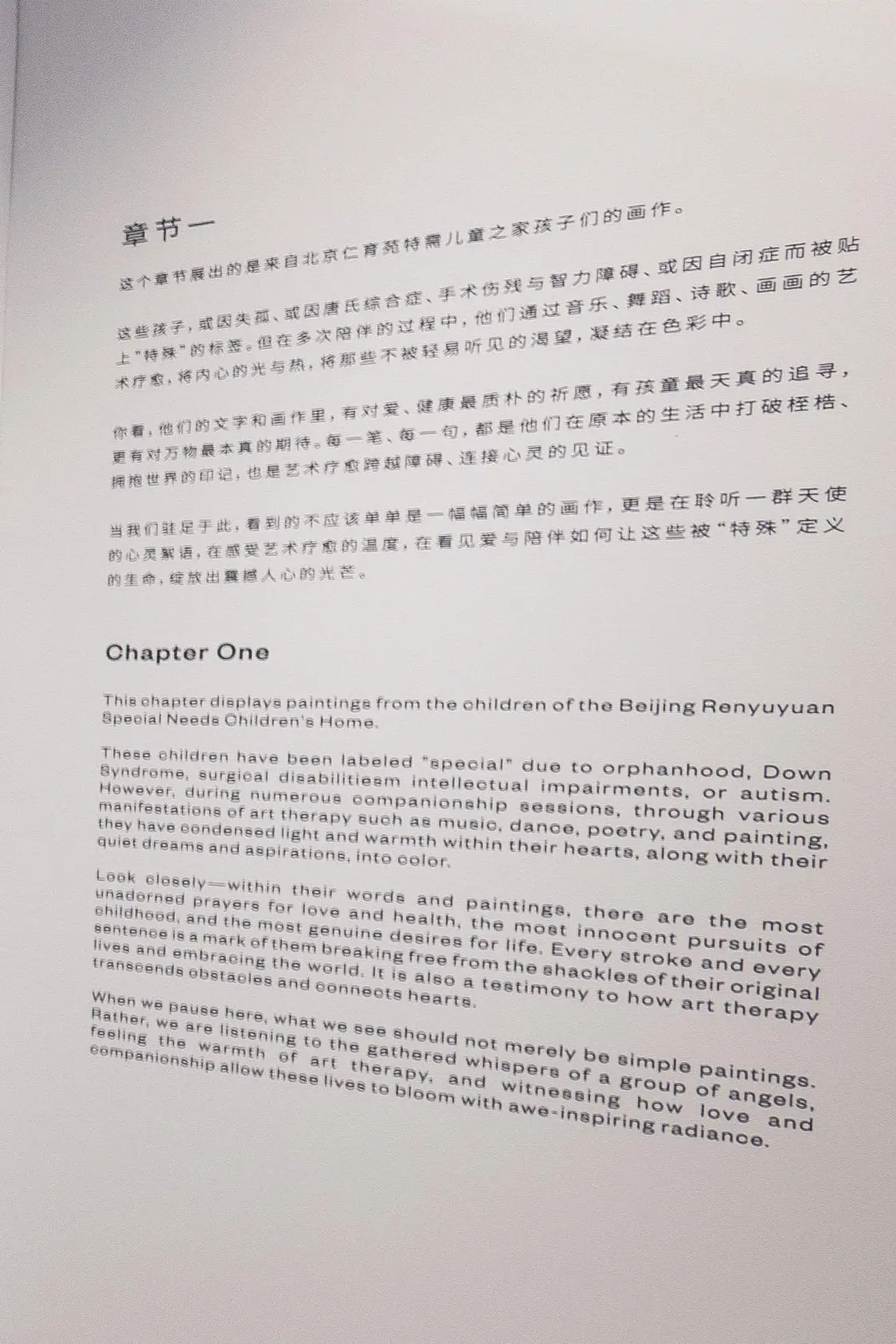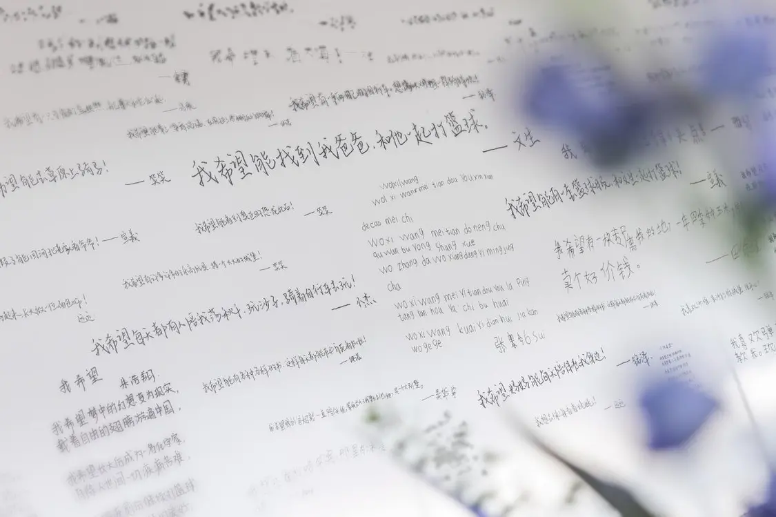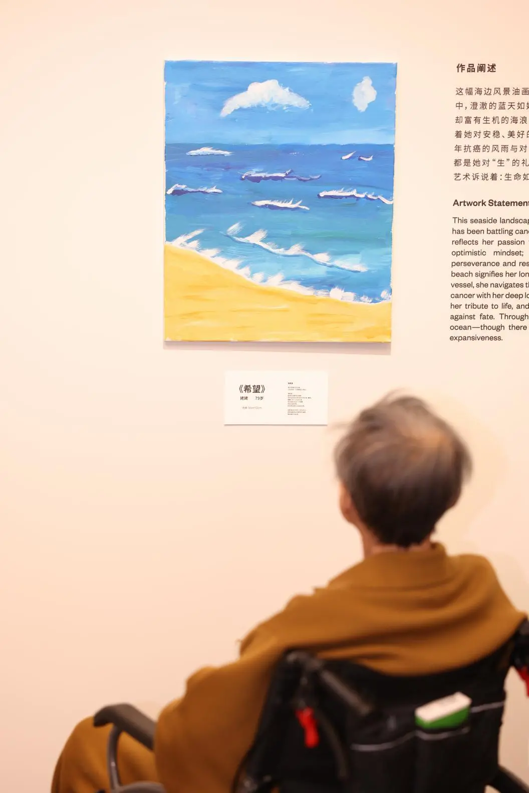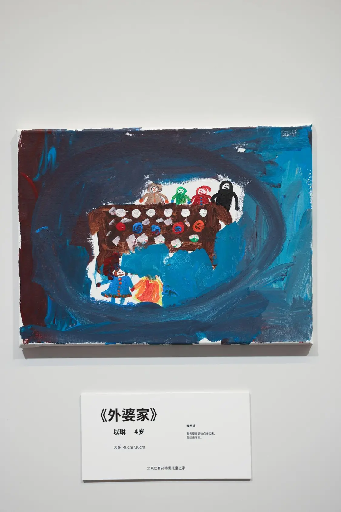 UCCA美术馆的大会客厅里,画作与诗歌静静陈列。创作者包括特需儿童(自闭症、唐氏综合症等)、骨肿瘤患者(多为儿童及青少年)与接受安宁疗护的老人。而搭建起他们与世界链接的,是清华附中国际部的高中生志愿者,用善意搭建起沟通的桥梁。