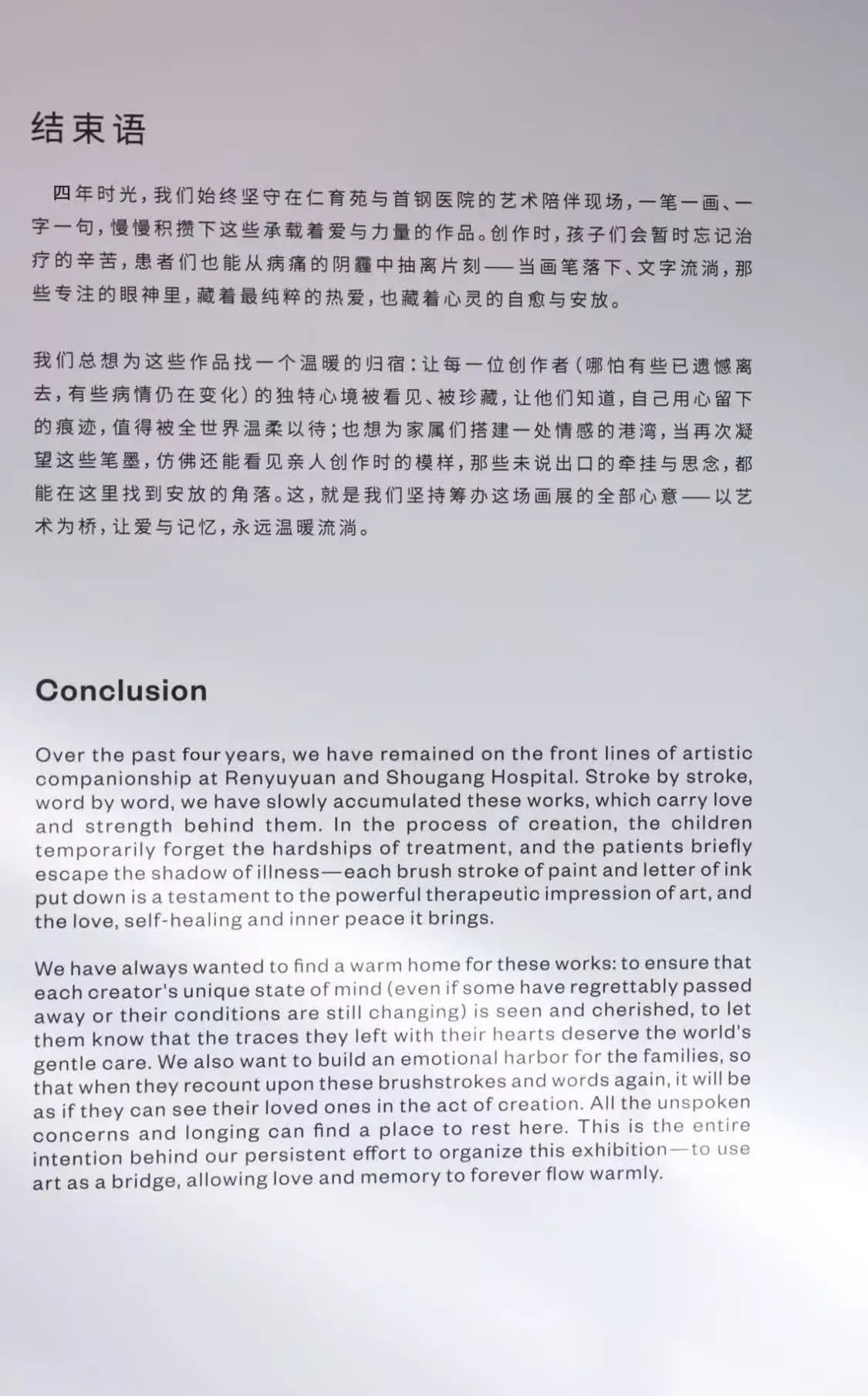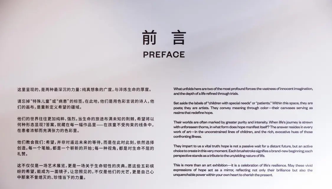 “我们的初衷本是付出与陪伴,却意外地在与他们相处的时光里,被他们的纯真与坚韧一次次深深治愈。”策展人佟知霏说。“我们本以为带去的是艺术,却发现收获的,是关于坚韧与珍惜最生动的一课。这是一场双向的温暖奔赴。如今,我们将这些动人的生命印记呈现于此,愿每一种色彩里的力量,每一行诗句中的微光,都能找到新的回响。”佟知玲说。